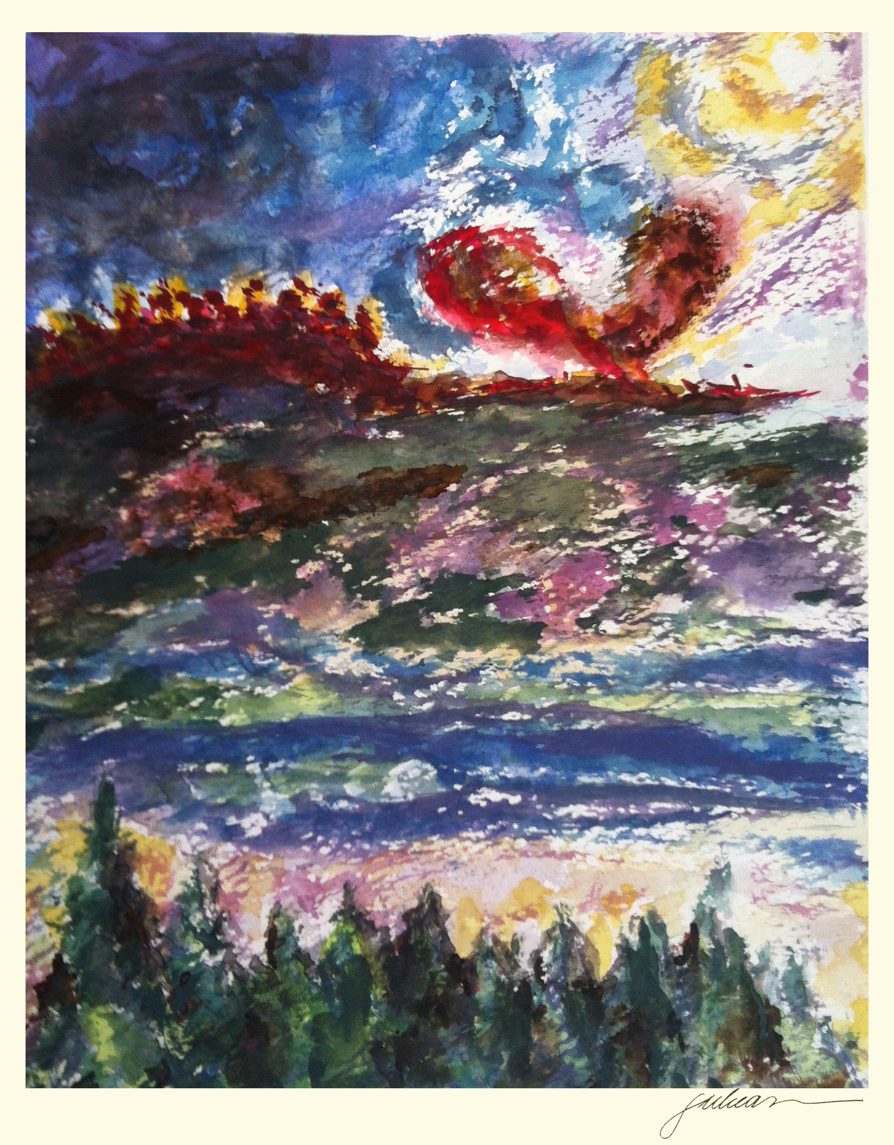 While painting this I felt called to pick up the red and place a bold heart shape on the mountain rim. From there, points of fire sprung up —