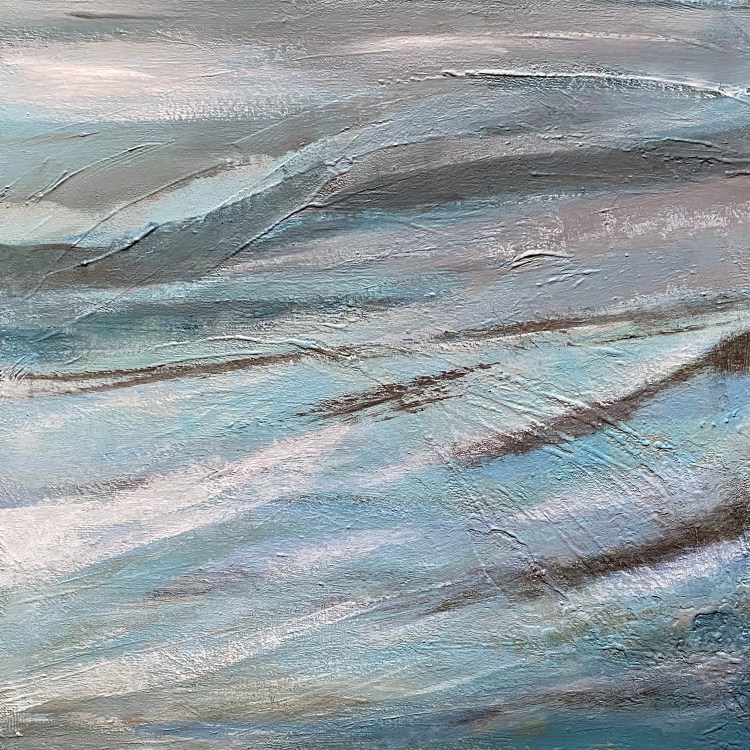 “Receive is now here. It was a struggle, a huge journey with 8+ hour practice sessions and chasing the light as it faded in the Loft. The challenge in this piece was the very rough texture which wanted to assert itself and fought with the process. Only by my staying with it was it able to reconcile itself on the canvas, allowing the resting place to appear.