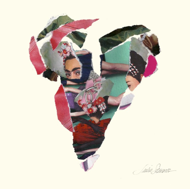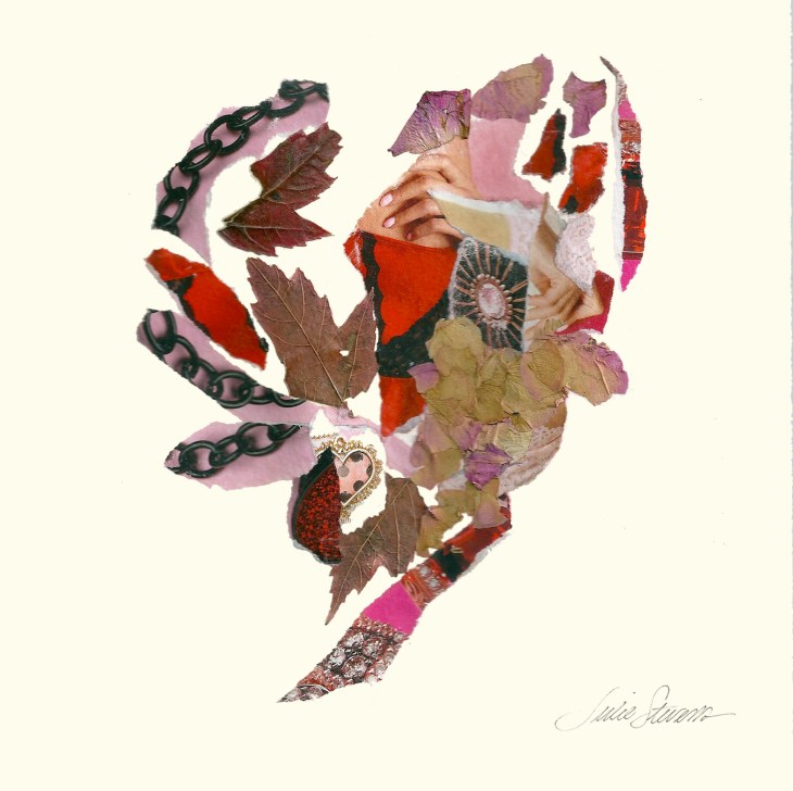 The torn heart series came from my playing around with making Valentines in 2011. I started with a pile of old art and fashion magazines and some dried sage and rose petals. Then a couple of stray pieces of watercolor paper presented themselves and I reached for the Aleene’s Original Tacky Glue. While ripping interesting shapes from images that caught my eye, I was aware that I was dismantling and disrupting the careful art direction of another creative soul. The torn edges that started to arrange themselves on the canvas reminded me of the places where human hearts might be broken. Some hairline fractures. Others more gaping in nature. Still more — overlapping and scar like.
